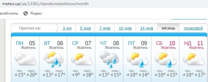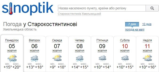 10 жовтня - у Старокостянтинові протягом усього дня небо буде вкрите хмарами. Вранці піде дрібний дощ. У другій половині дня опадів не передбачається. +15.