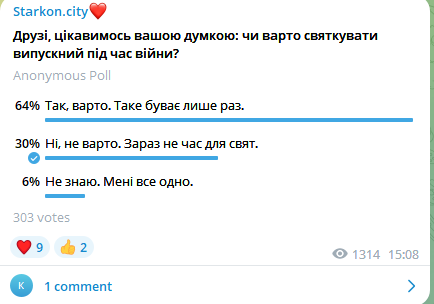У телеграм-каналі сайту Starkon.city ми запустили опитування. Питання одне для всіх: чи варто святкувати випуск під час війни? Дивіться,який отримали результат