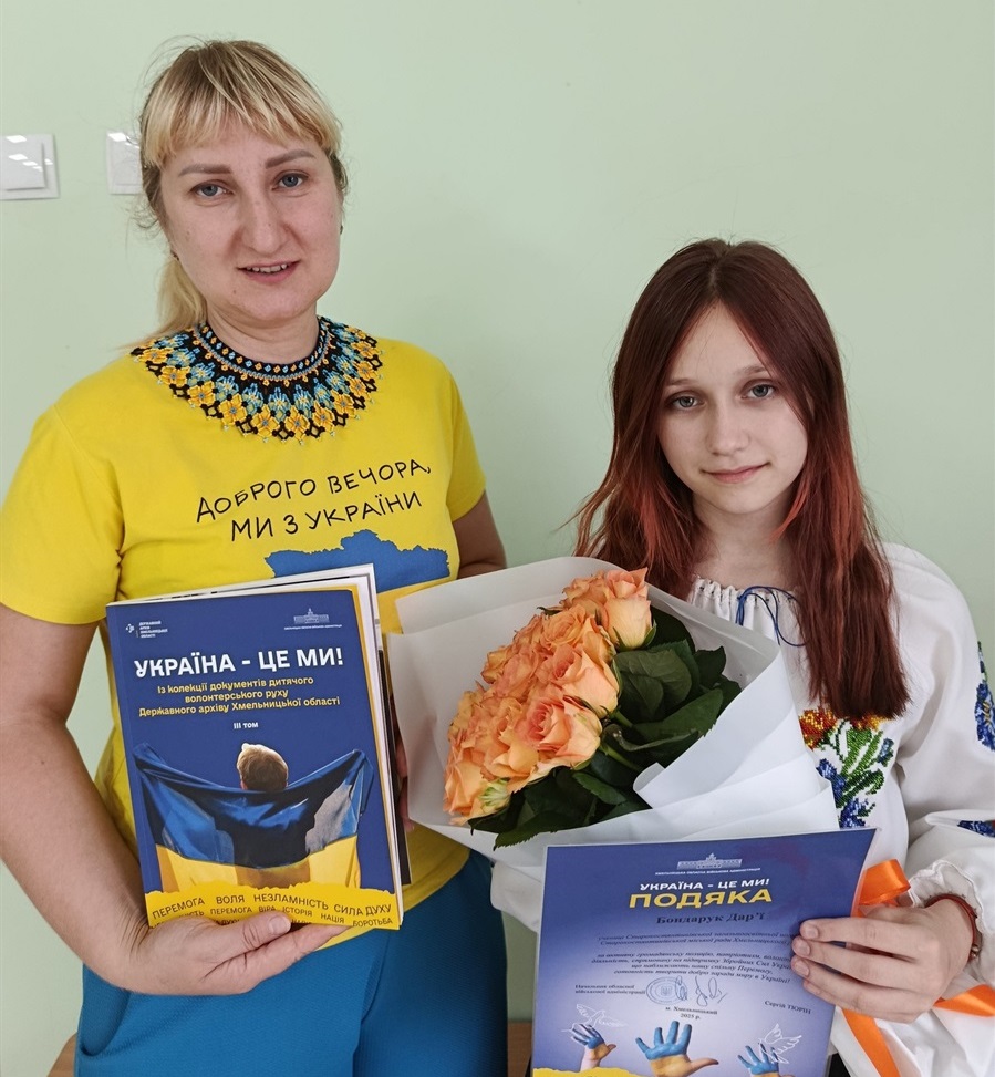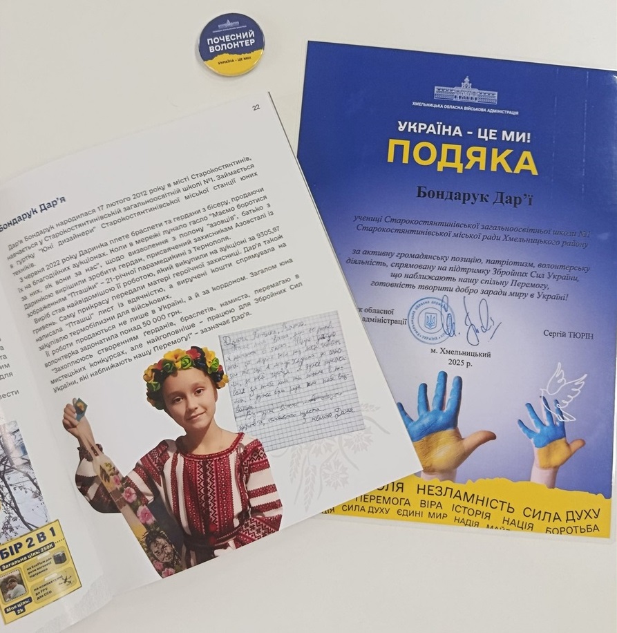Начальник Хмельницької ОВА Сергій Тюрін відзначив вихованку Станції юних техніків Дар'ю Бондарук Подякою Обласної військової адміністрації за активну волонтерську діяльність. Також її ім’я внесено до ІІІ тому збірника про дитячий волонтерський рух «Україна – це ми!».