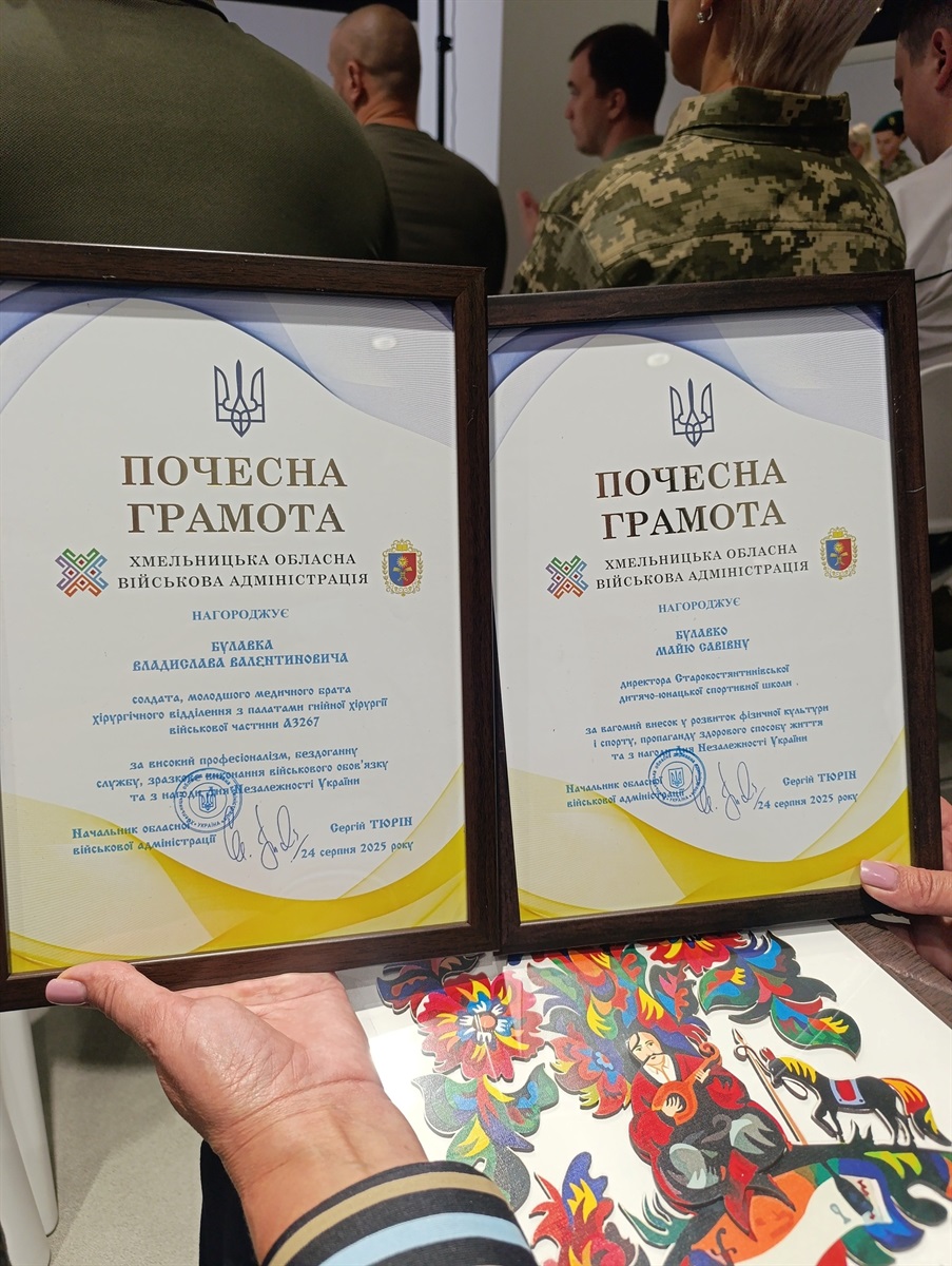 Почесною грамотою Хмельницької обласної військової адміністрації нагороджена директорка Старокостянтинівської дитячо-юнацької спортивної школи Майя Булавко. Таку ж відзнаку отримав і її син — солдат, молодший медичний брат Владислав Булавко.