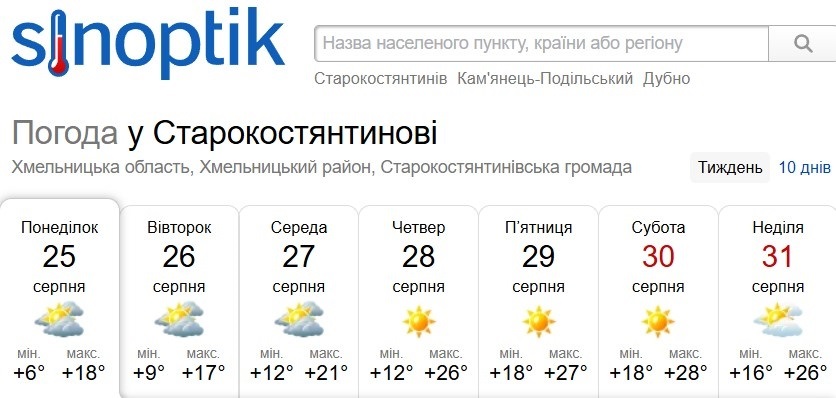 Сайт sinoptik.ua дає старокостянтинівцям такий прогноз на тиждень: