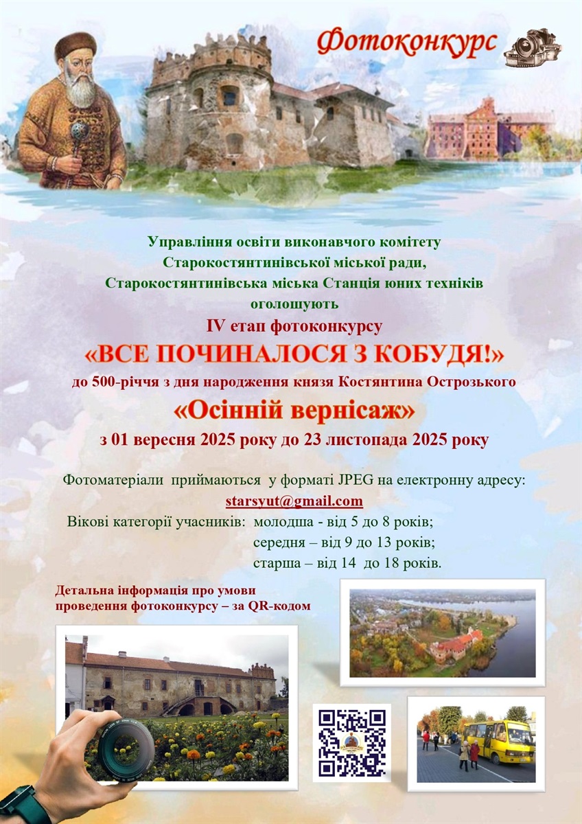 З 1 вересня по 23 листопада 2025 року триватиме IV етап міського фотоконкурсу «Все починалося з Кобудя!» до 500-річчя від дня народження князя Костянтина Острозького. Цього разу учасникам пропонують зафіксувати осінню красу Старокостянтинова в межах теми «Осінній вернісаж».