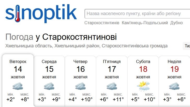 Сайт sinoptik.ua дає старокостянтинівцям такий прогноз на тиждень:
