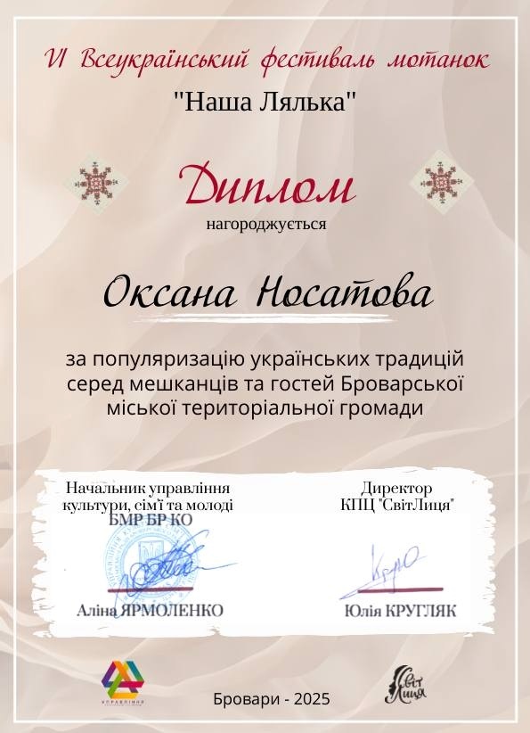 Мешканка Старокостянтинівської громади Оксана Носатова отримала диплом VI Всеукраїнського фестивалю мотанок “Наша Лялька”, який відбувся у Броварах.