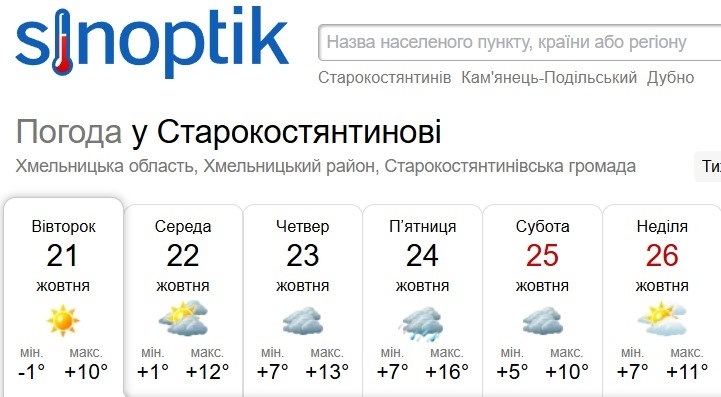 Сайт sinoptik.ua дає старокостянтинівцям такий прогноз на тиждень: