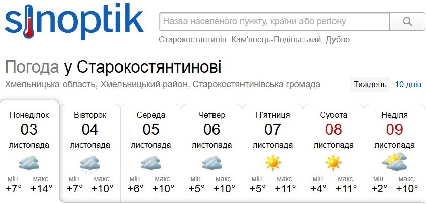 Сайт sinoptik.ua дає старокостянтинівцям такий прогноз на тиждень: