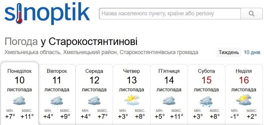 Сайт sinoptik.ua дає старокостянтинівцям такий прогноз на тиждень: