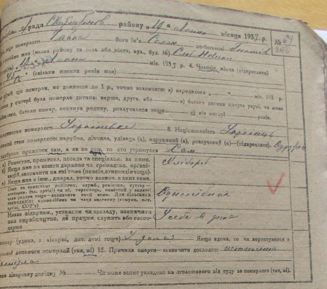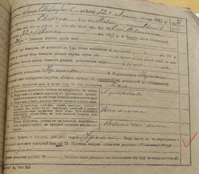Відкриваємо Книги державної реєстрації актів цивільного стану (метричні книги) Старокостянтинівського районного відділу реєстрації актів громадянського стану по місту Старокостянтинів та Старокостянтинівському району Хмельницької області за 1933 рік та спробуємо перевірити: чи дійсно були записи про смерть від голоду у нашому регіоні? Шукати довго не довелося - таких записів достатньо.