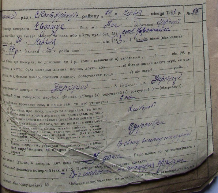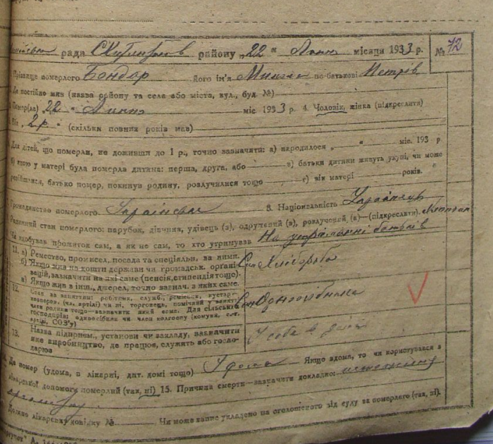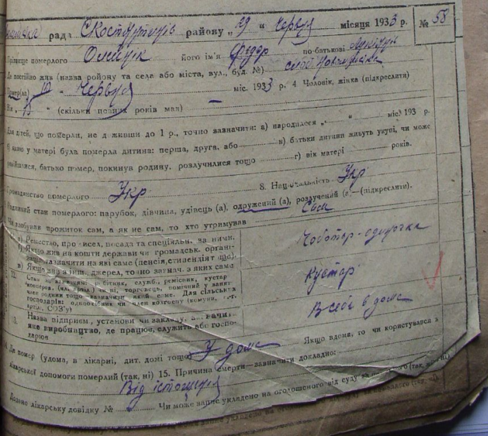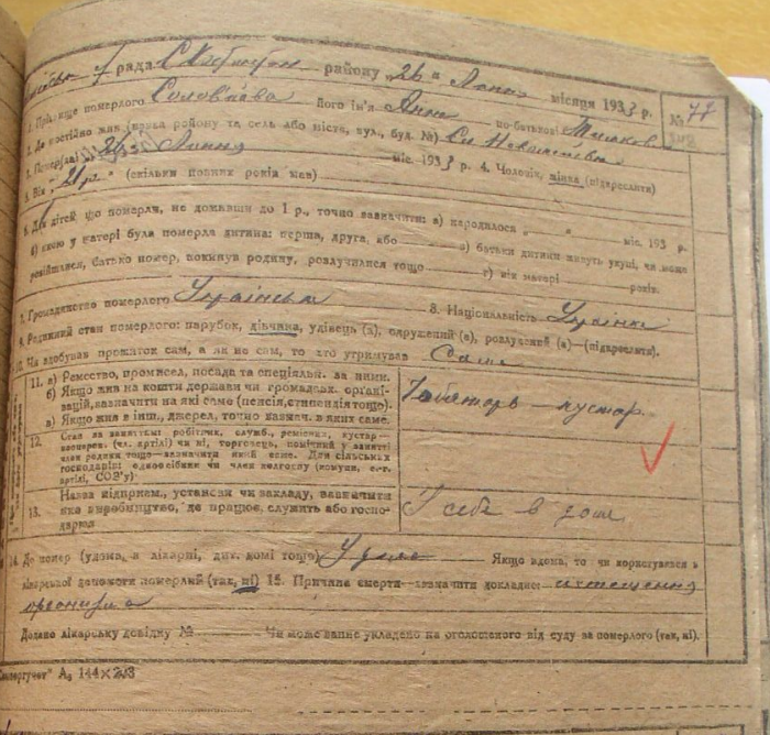 Ось інший запис. Чайка Роман, 45 років, проживав, як зараз кажуть, на Новиках. Українець, хлібороб, одноосібник. Хлібороб... Помер "від істощенія організма"...