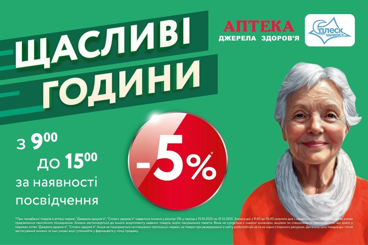 З 15 жовтня по 31 грудня 2025 року в аптеках «Джерела здоров’я» діє акція «Щасливі години».