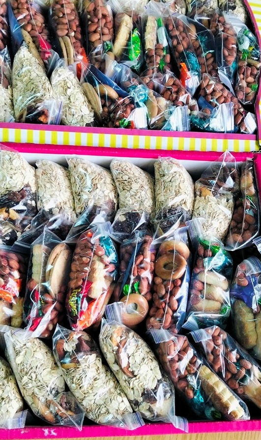 До стандартного набору входять горіхи, сухофрукти, насіння, інколи вітамінні мікси та навіть домашні смаколики. Все залежить від того, що люди принесуть.
