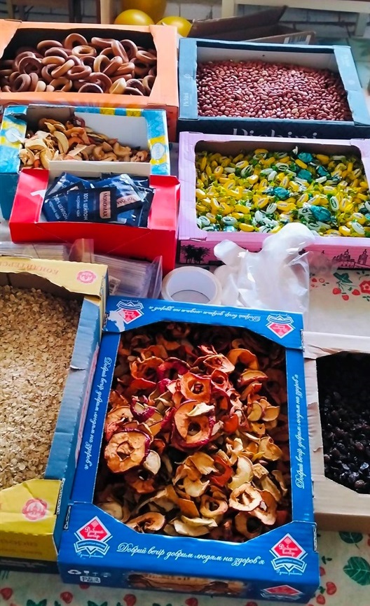 Окрім сухих наборів, збирають для військових: вологі серветки, засоби гігієни, консервацію, овочі та фрукти, малюнки та браслетики від дітей.
