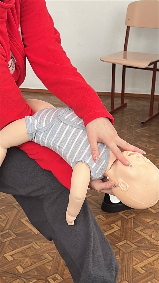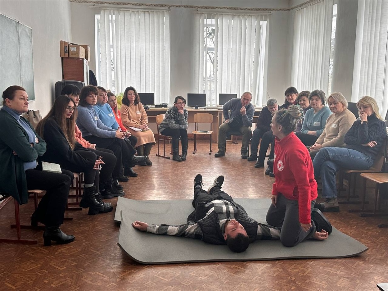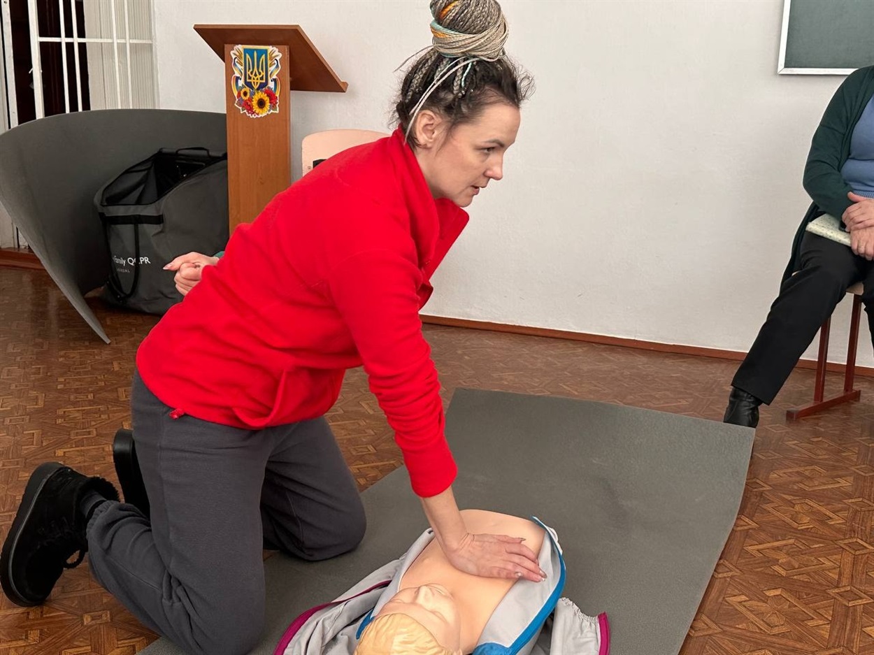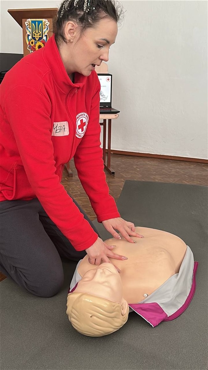 Інструктор з першої допомоги Хмельницької міськрайонної організації Товариства Червоного Хреста Марія Мішина детально пояснювала кожен етап надання допомоги, демонструвала чіткі алгоритми дій та супроводжувала практичні вправи. Освітяни активно відпрацьовували навички на практиці, працюючи один з одним, що допомогло не лише закріпити знання, а й набути впевненості у власних діях.