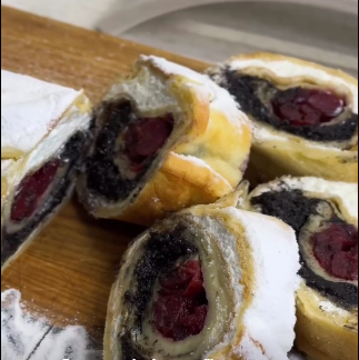 Викласти начинки смужками: вишня → мак → сир.