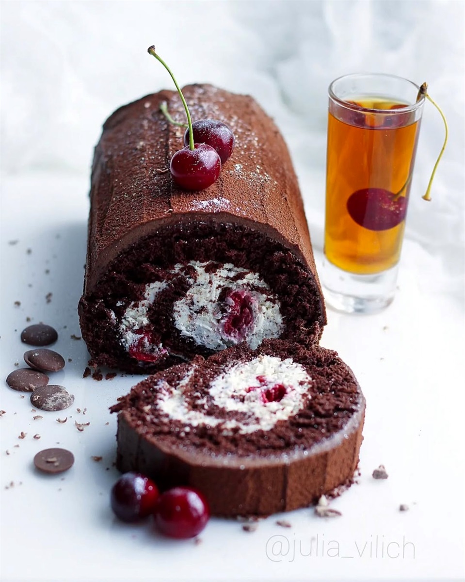 Теплим вишневим сиропом пропитуємо корж, промазуємо кремом і викладаємо вишні в довільному порядку. Загортуємо рулет, пропитуємо верх та боки вишневим сиропом і загортуємо в харчову плівку (так волога утримається всередині і рулет максимально просочиться). Ховаємо в холодильник на 5 год.