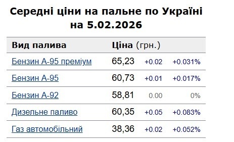 Середні ціни на пальне по Україні на 5.02.2026 за інформацією, оприлюдненою на фінансовому порталі "Мінфін", такі: