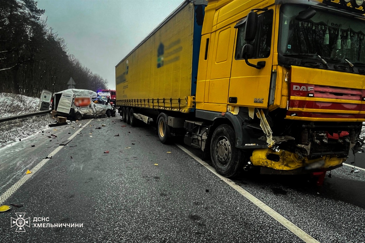 У Хмельницькому районі, поблизу села Подільське, сталось зіткнення мікроавтобуса «Renault Trafic» з вантажівкою «DAF». Внаслідок аварії водій мікроавтобуса загинув. На місці працювали рятувальники, які ліквідували наслідки ДТП. Обставини події наразі встановлюють правоохоронці.