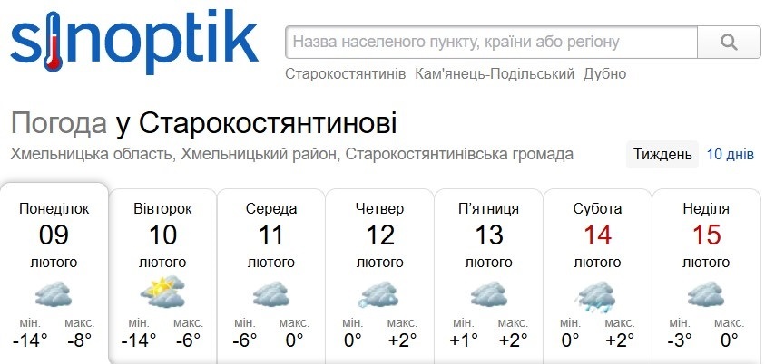 У Старокостянтинові найближчими днями переважатиме хмарна погода без істотних опадів. Лише 12 лютого можливий дрібний сніг, а в ніч на 14 лютого — невеликий дощ. Водночас синоптики фіксують поступове послаблення морозів по всій Україні.