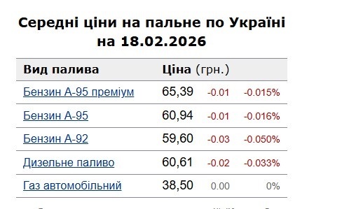 Середні ціни на пальне по Україні на 18.02.2026 за інформацією, оприлюдненою на фінансовому порталі "Мінфін", такі: