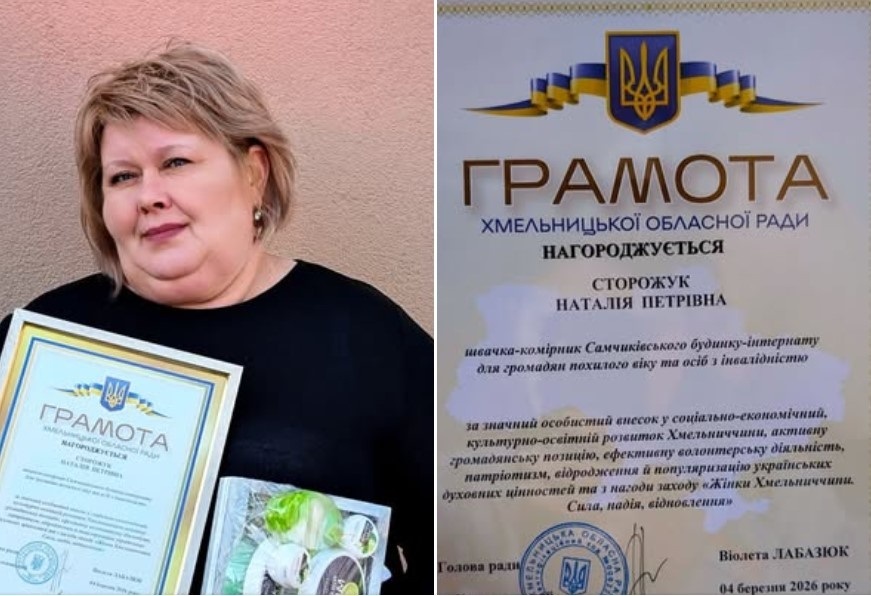 Працівницю Самчиківського будинку-інтернату для громадян похилого віку та осіб з інвалідністю Наталію Сторожук представлено на обласному заході «Жінки Хмельниччини. Сила, надія, відновлення», який відбувається за підтримки Хмельницької обласної ради.