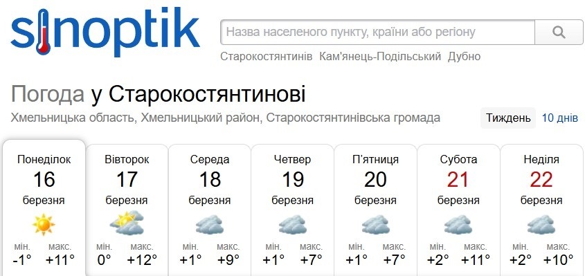 Сайт sinoptik.ua дає старокостянтинівцям такий прогноз на тиждень: