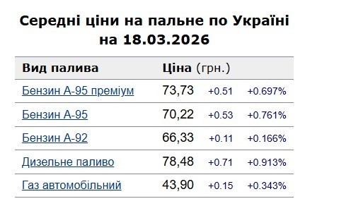 Середні ціни на пальне по Україні на 18.03.2026 за інформацією, оприлюдненою на фінансовому порталі "Мінфін", такі: