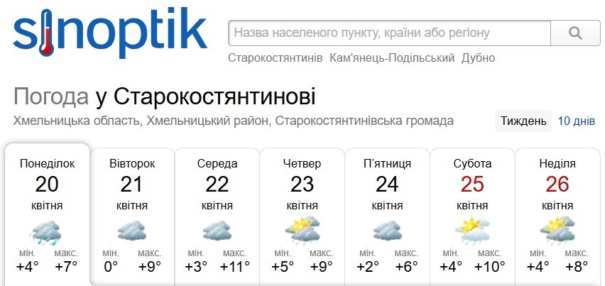 Сайт sinoptik.ua дає старокостянтинівцям такий прогноз на тиждень: