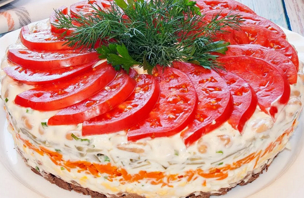 Викладати шарами на порційні тарілки, змащуючи майонезом: