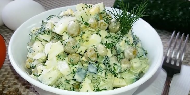 Потрібно: 1 склянка молодого зеленого горошку, 2 середні огірки, 3 яйця, 100 грамів зеленої цибулі, м'який плавлений сир типу «Янтар», сіль, перець за смаком.
