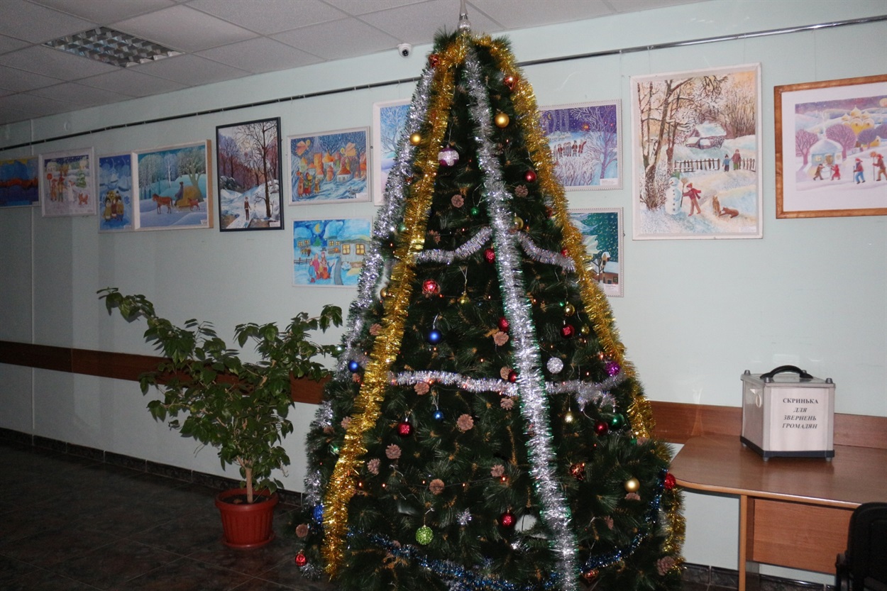 У міську раду в ці дні можна прийти на зимову виставку картин учнів дитячої художньої школи. У фойє мерії традиційно поставили ялинку, де теж можна зробити кілька фото.