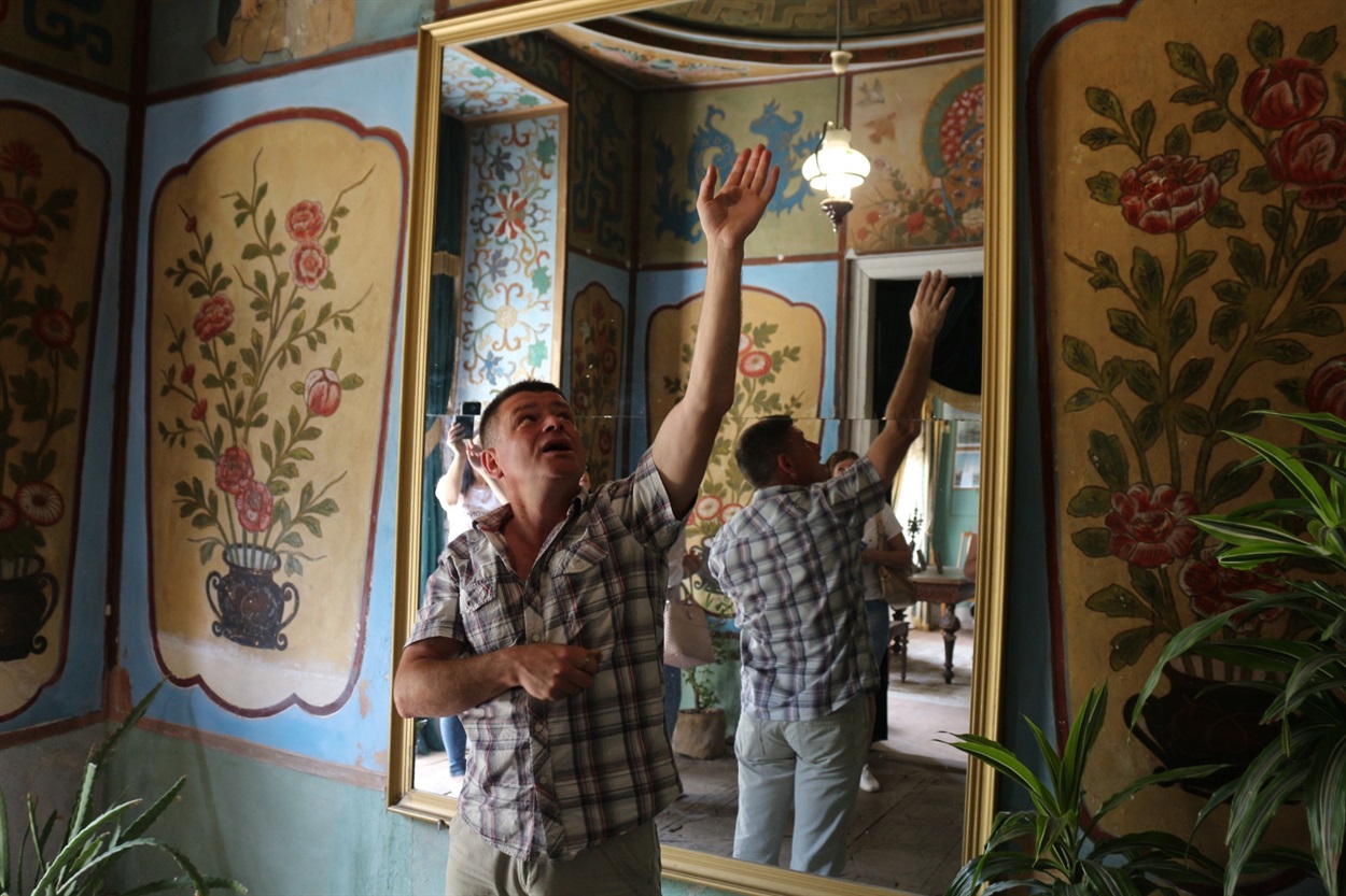 Стіни тут повністю вкриті фресками і розписані у три яруси. Нижній — панель з декоративним візерунком, середній — вазони із хризантемами, а верхній — то уже сюжети: самураї з мечами і за писанням книг, японка з парасолькою, журавель, дракони, метелики, рослинні та геометричні візерунки, ієрогліфи. Історики кажуть: японська кімната — модне віяння часу.